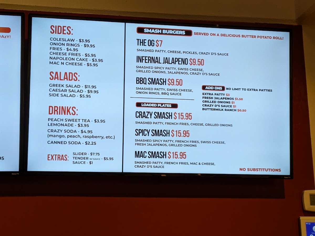 Smashed patty, cheese, pickles, Crazy D's Sauce, buttered potato roll